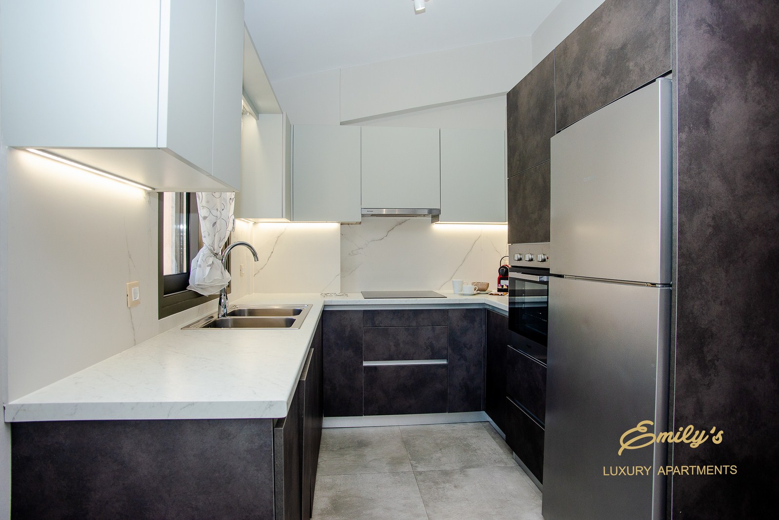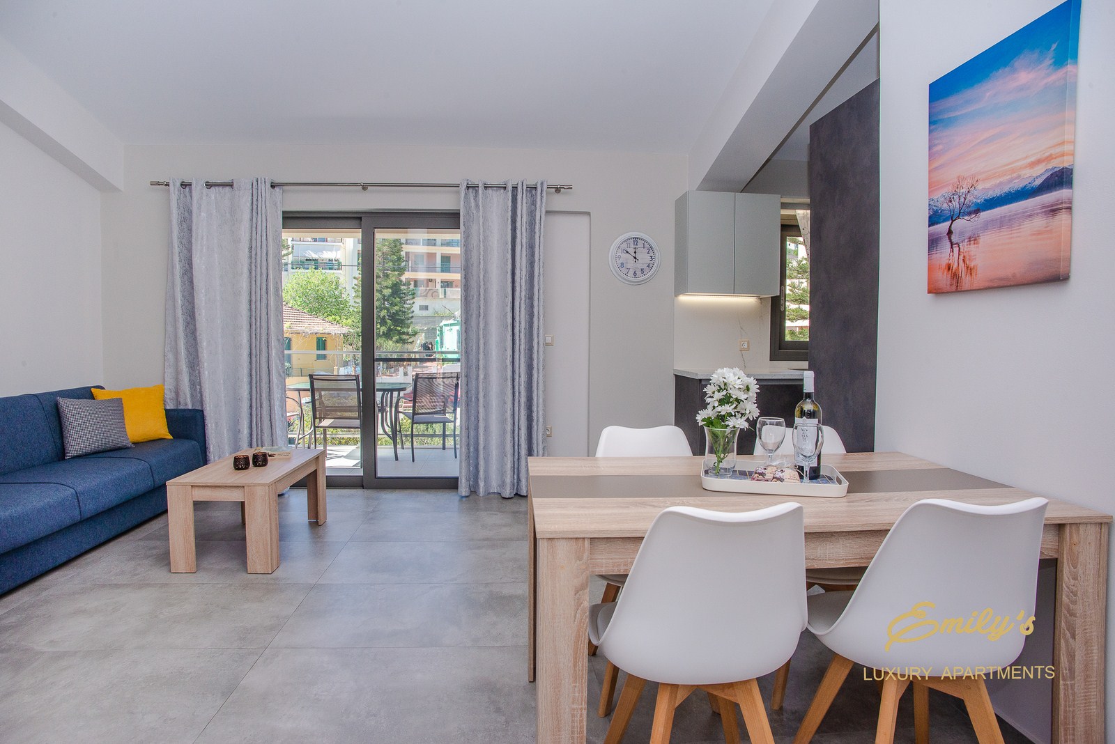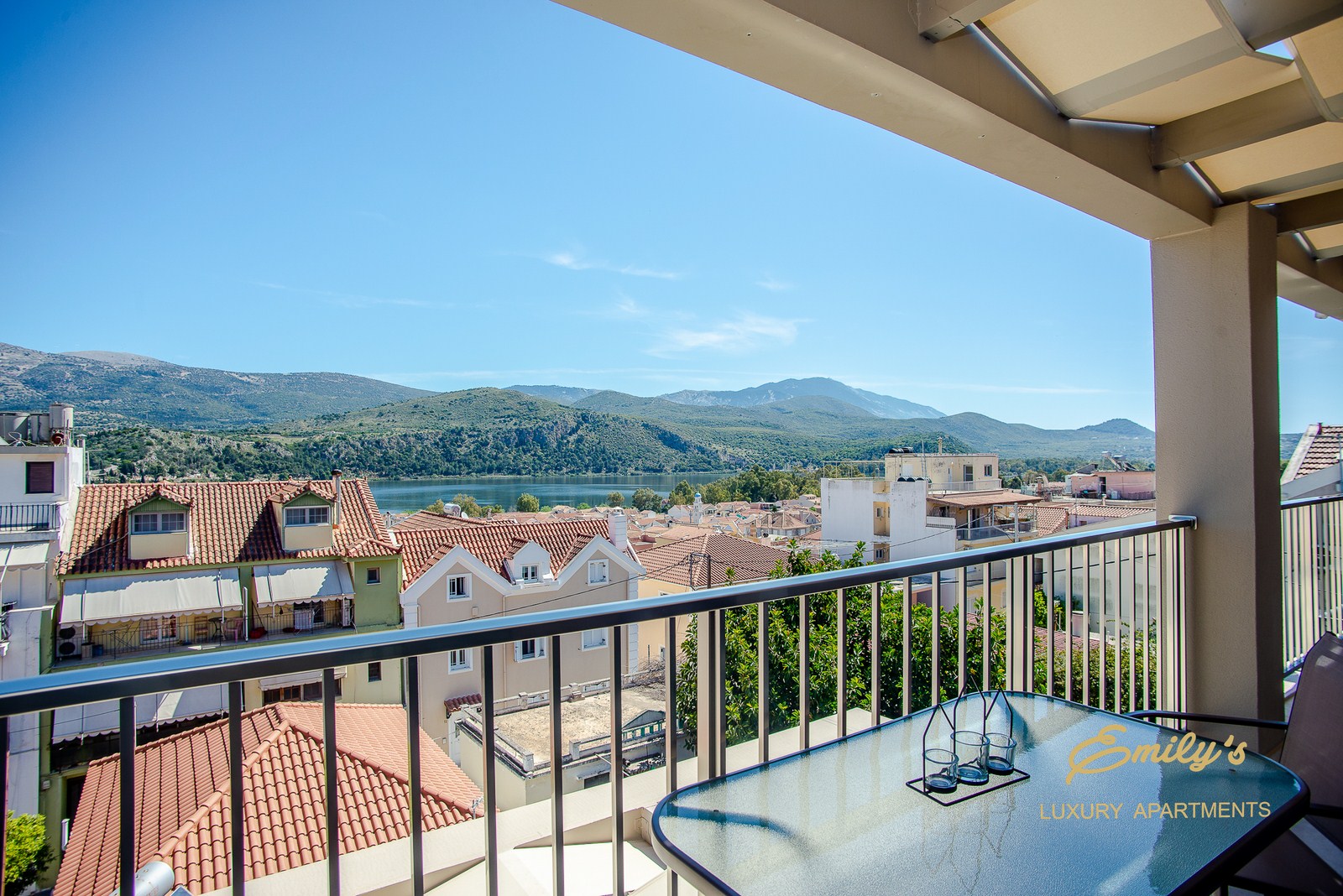 Η μία πλευρά του διαμερίσματος έχει πανοραμική θέα στην πόλη και στον κόλπο του Αργοστολίου, ενώ η άλλη έχει θεά σε πάρκο.